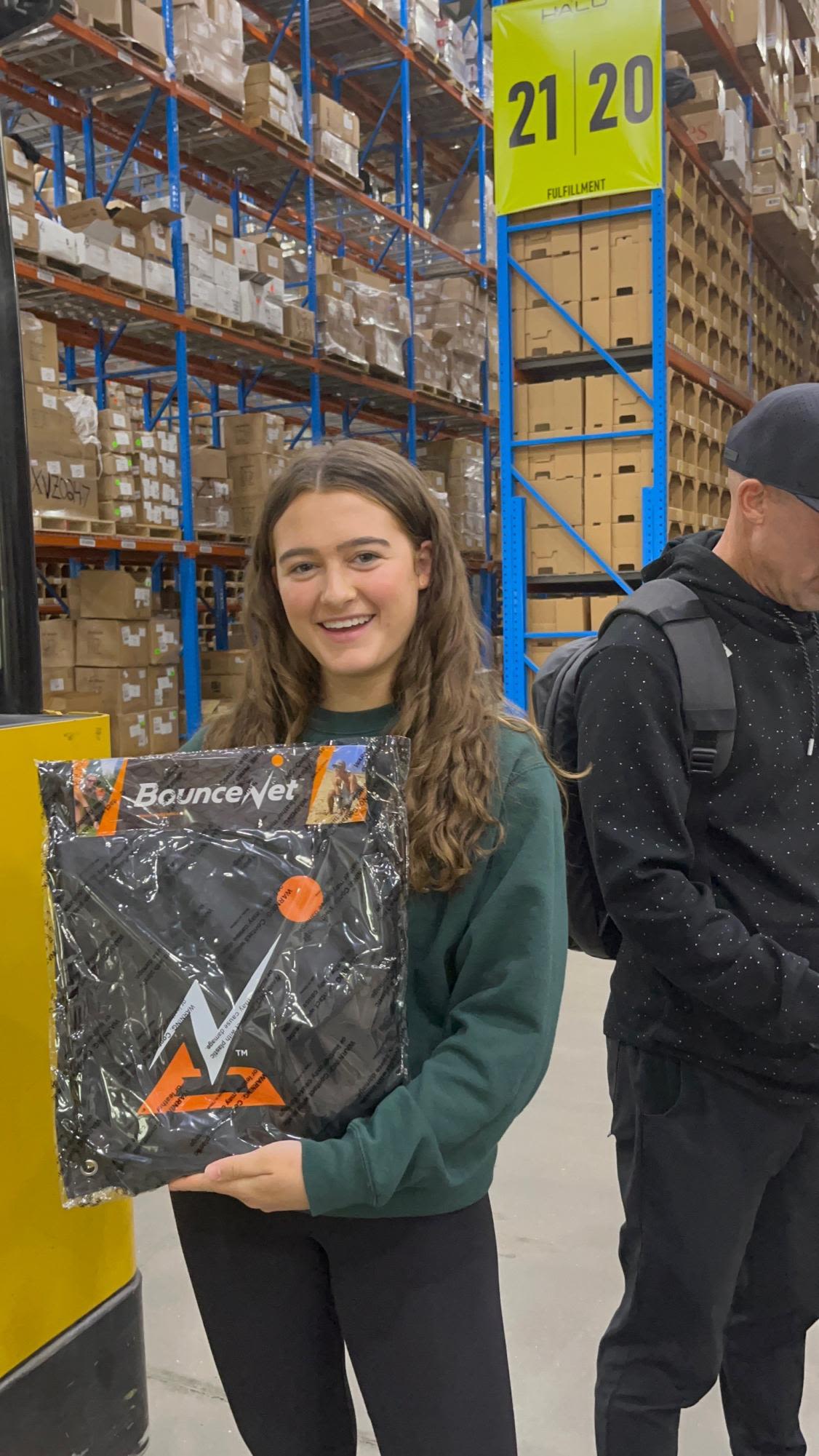 Cradling one of the first finished BounceNet packages, Ella Mavros holds more than just a product—she holds a piece of a journey she’s been part of from the start. Photo Courtesy of: Jeff Mavros